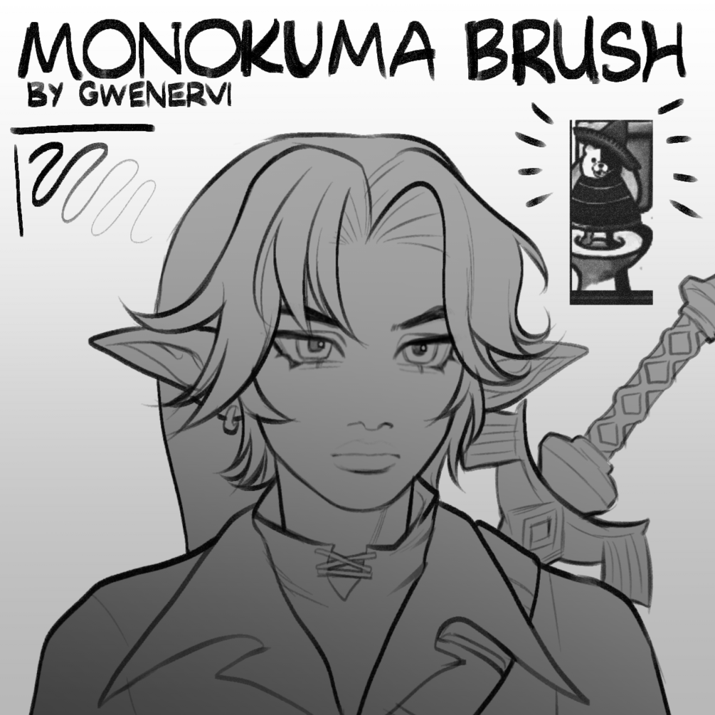 I really enjoy the vertical length of the brush since it creates visual intrigue and line variety without much extra work. The brush does feature a bit of texture and size variety, so you can create even more variety by using more or less pressure. The Monokuma image creates a staircase-like texture which gives a scratchy or pixelated feel to your lines, this effect is more visible the bigger the brush is so I suggest keeping the brush relatively small. I think around 14px is a sweet spot.